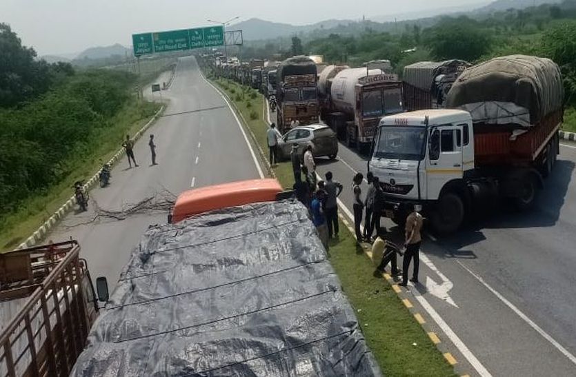 ब्यावर समीप उदयपुर रोड एवं केसरपुरा बाइपास पर ट्रक चालकों की ओर से लगाए जाम में फंसे वाहन।