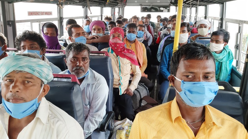 केकड़ी से अजमेर रवाना होने के लिए बस में बैठे बिहारी श्रमिक।