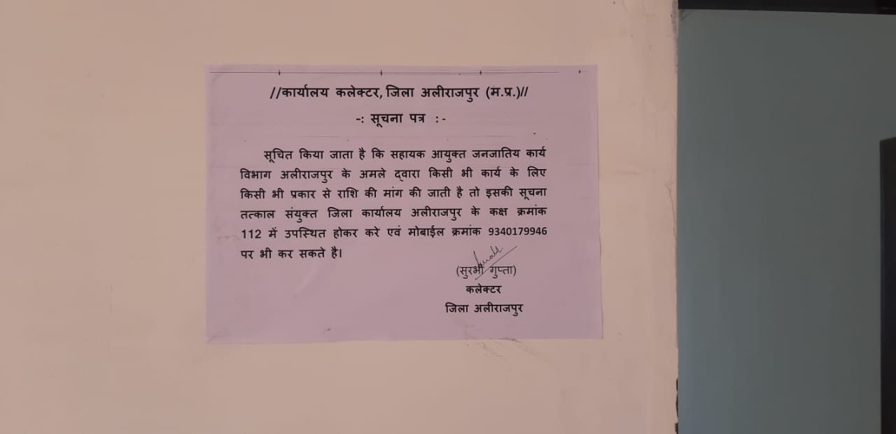 आलीराजपुर. जिले के सरकारी विभागों में काम-काज के लिए कांग्रेस के जिलाध्यक्ष और विधायक द्वारा अधिकारियों पर रिश्वत मांगने का आरोप लगाने के बाद कलेक्टर ने शिकायत करने के लिए एक नंबर जारी किया है। इसके पर्चे अलग-अलग विभागों में लगवाए गए हैं। सहायक आयुक्त कार्यालय के बाहर कलेक्टर सुरभि गुप्ता का रिश्वत मांगने वालों की शिकायत करने का पर्चा चस्पा। जिस कार्यालय के बाहर ये पर्चा चस्पा है, उसी कार्यालय में रिश्वत मांगने का आरोप सामने आया है।