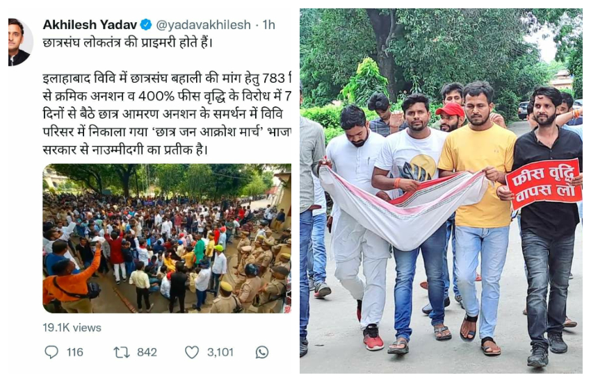 प्रयागराज: इलाहाबाद विश्वविद्यालय छात्र संघ भवन पर फीस वृद्धि के विरोध में व छात्रसंघ बहाली की मांग को लेकर चल रहे छात्रसंघ संयुक्त संघर्ष समिति के नेतृत्व में अनशन का 784वां दिन व आमरण अनशन का 8 वां दिन भी जारी रहा। फीस वृद्धि के विरोध में आमरण अनशन के आठवें दिन सपा के राष्ट्रीय अध्यक्ष अखिलेश यादव का ट्वीट व फेसबुक के माध्यम से समर्थन मिला है।