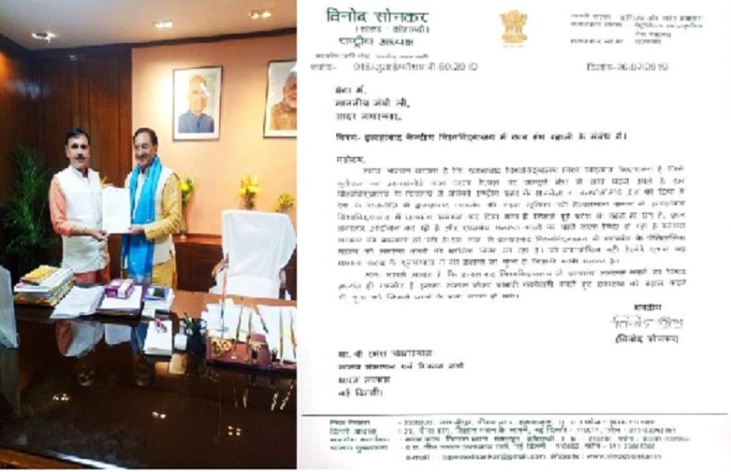 मानव संसाधन विकास मंत्री को दिए गए पत्र को सांसद विनोद सोनकर ने सोशल मीडिया पर साझा करते हुए लिखा है कि इलाहाबाद विश्वविद्यालय में पुनः छात्रसंघ बहाल करने के लिए Ministry of Human Resource Development , Government of India मंत्री Dr.Ramesh Pokhriyal Nishank को ज्ञापन दिया। और उन्होंने जल्द से जल्द छात्रसंघ बहाल करने का आश्वाशन दिया। भाजपा सांसद द्वारा दिए गए ज्ञापन में कहा गया है कि इलाहाबाद विश्वविद्यालय विश्व विख्यात विश्वविद्यालय है। जिसे पूरब का आक्सफोर्ड भी कहा जाता है। यहां पर संपूर्ण देश के छात्र पढ़ने आते हैं। विश्वविद्यालय के छात्र संघ ने को राष्ट्रीय स्तर की राजनीतिक और जनप्रतिनिधि देश को दिए है। देश की राजनीति इलाहाबाद विश्वविद्यालय के छात्र संघ की अहम भूमिका है। वर्तमान समय में इलाहाबाद विश्वविद्यालय छात्र संघ समाप्त किया गया है। जिससे छात्रों में रोष है छात्र लगातार आंदोलन कर रहे हैं। और छात्र संघ समाप्त करने पर चारों तरफ से सरकार की बदनामी हो रही है। इस तरह से इलाहाबाद विश्वविद्यालय में छात्रसंघ को समाप्त करने की साजिश की जा रही है।जो न्यायोचित नहीं है , सांसद ने पत्र में सदन का भी जिक्र करते हुए कहा है कि मेरे द्वारा मामला सदन में उठाया जा चुका है। अतः आपसे आग्रह है कि इलाहाबाद विश्वविद्यालय में छात्रसंघ समाप्त करने का विषय अत्यंत ही गंभीर है। इसका संज्ञान लेकर प्रभावी कार्यवाही करते हुए छात्र को बहाल करने की कृपा करें और छात्रों के साथ न्याय हो सके।