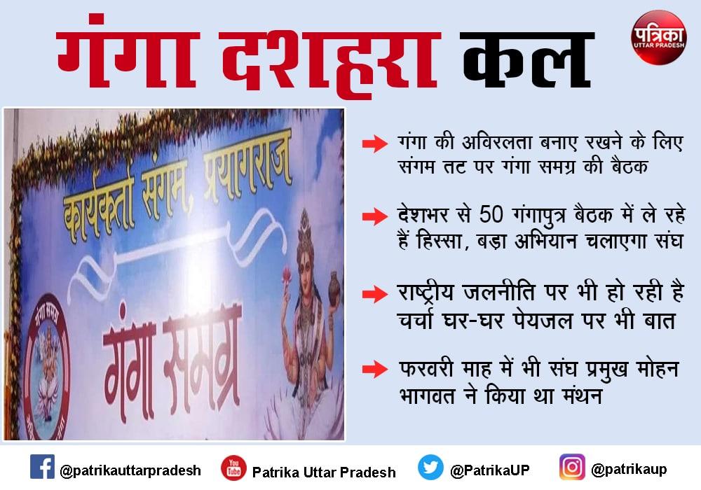 प्रयागराज. गंगा दशहरा के मौके पर प्रयागराज में संगम तट पर गंगापुत्रों का जुटान हुआ है। वहां दो दिनों तक गंगा की अविरलता और और निर्मलता बनाए रखने पर मंथन चलेगा। राष्ट्रीय स्वयं सेवक संघ (आरएसएस) के अनुषांगिक संगठन गंगा समग्र की राष्ट्रीय बैठक 20 जून को प्रयागराज के झूंसी स्थित गंगा धाम में होगी। बैठक में जहां एक तरफ इस बात की समीक्षा और मंथन किया जाएगा कि बीते एक साल में क्या काम हुए तो वहीं आने वाले साल के लिये कार्ययोजना भी तैयार की जाएगी। राष्ट्रीय जलनीति पर भी चर्चा हो रही है और घर-घर पेयजल भी बैठक के विषय में शामिल है। उसके एक दिन पहले 19 जून को यहां गंगा समग्र न्यास बोर्ड की बैठक हो रही है। दो दिनों तक चलने वाले आयोजन में गंगा समग्र के केन्द्रीय व प्रांतीय पदाधिकारियों के अलावा संयोजक व सह संयोजक आदि लगभग 50 पदाधिकारी शामिल हो रहे हैं।
