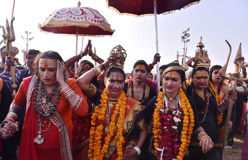 किन्नर अखाड़ा की महामंडलेश्वर आचार्य लक्ष्मीनारयण त्रिपाठी सबसे आगे चल रही थी और उनके पीछे किन्नर अखाड़ा के अन्य सदस्य शामिल थे। निर्धारित समय पर किन्नर अखाड़ा संगम पहुंचा और स्नान किया। किन्नर अखाड़े को देखने के लिए लोगों की भीड़ वहां पर पहले से जमा हो गयी थी। पुलिस प्रशासन ने भी सुरक्षा के पर्याप्त व्यवस्था की थी इसलिए स्नान करते समय किसी प्रकार की दिक्कत नहीं होगी। किन्नर सिर पर कलश व मां काली की प्रतिमा लेकर चल रही थी।