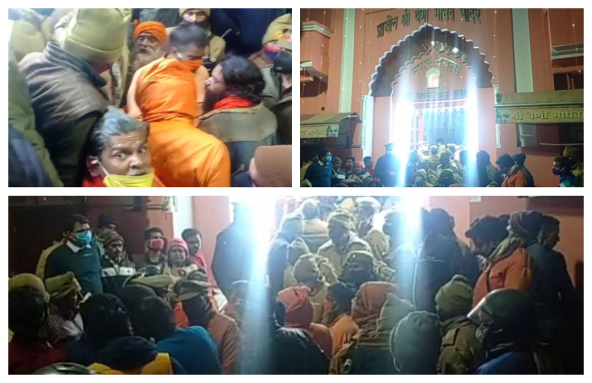 शनिवार की रात अचानक महानिर्वाणी अखाड़े के चार मढ़ी बाधला के रघुराज गिरि ने कई संतों के साथ मंदिर में प्रवेश किया और वेणी माधव भगवान का आर्शीवाद लिया। इसके बाद मंदिर में जमकर हंगामा काटा। संतों ने मठ में मौजूद सेवादारों को धमकाया और मठ को अपना बताते हुए खाली करने को कहने लगे। काफी देर तक संतों का नाटक चलता रहा है। मंदिर के पुजारियों और सेवादारों में नोकझोंक होती रही कि तभी पुलिस पहुंच गई। मौके पर पुलिस ने दोनों पक्षों को थाना ले जाकर बैठा दी।