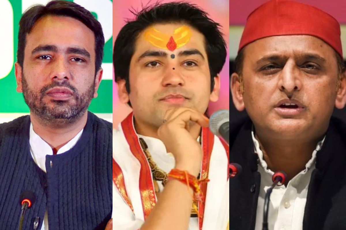 बाएं से जयंत चौधरी बीच में धीरेंद्र शास्त्री दाएं से अखिलेश यादव
