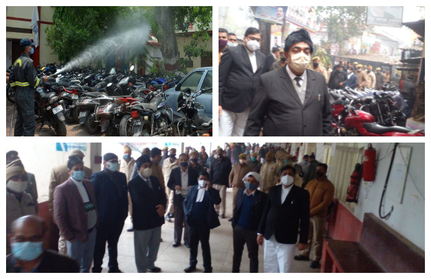 प्रयागराज: संगमनगरी में बढ़ रहे कोरोना मरीजों को लेकर एक तरह जहां इलाहाबाद हाईकोर्ट सख्त है वहीं दूसरी ओर जनपद न्यायालय ने भी कड़े कदम उठाए हैं। जनपद न्यायाधीश इलाहाबाद नलिन कुमार श्रीवास्तव के निर्देशानुसार अपर जनपद न्यायाधीश प्रथम आरके शुक्ला की नेतृत्व में गुरूवार को समस्त न्यायालय परिसर का निरीक्षण किया गया।