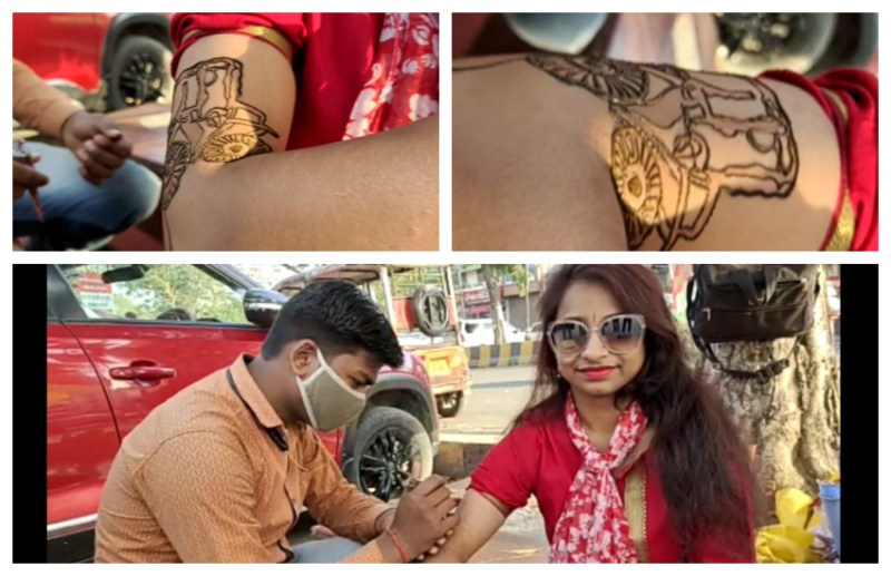 महिलाएं मेहंदी में अक्सर फूल पत्तियों या प्राकृतिक डिजाइन ही बनवाए जाते हैं, लेकिन दोबारा सरकार बनने की बात अब बुलडोजर भी मेहंदी की डिजाइन में शामिल हो गया है। यह देखिए आप भी प्रयागराज में कैसे एक महिला अपने हाथों पर मेहंदी से बुलडोजर की आकृति बनवा रही है ।