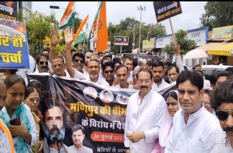 मणिपुर में लंबसे समय से चल रही हिंसा और इस पर प्रधानमंत्री की ओर से चुप्पी साधने को लेकर जिलेभर से आए कांग्रेसजनों ने पैदल मार्च निकाला। जिला स्तरीय यह पैदल मार्च मोती डूंगरी स्थित चिल्ड्रन पार्क से रवाना हुआ और सभी नेता पैदल ही हाथों में नारों की तख्तियां लिए नारेबाजी करते मिनी सचिवालय पहुंचे। पैदल मार्च के बाद प्रधानमंत्री नरेंद्र मोदी की चुप्पी के विरोध में राष्ट्रपति के नाम सिटी मजिस्ट्रेट नवीन यादव को ज्ञापन सौंपा गया।