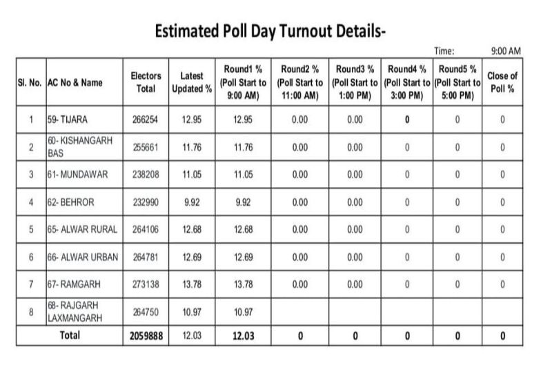 अलवर लोकसभा चुनाव के लिए कुल 9 प्रत्याशी मैदान में हैं। इनकी किस्मत का फैसला मतदाता करेंगे। अलवर लोकसभा सीट के लिए मतदान सुबह 7 बजे से शुरू हुआ। अलवर लोकसभा सीट के लिए सुबह 9 बजे तक 12.3 मतदान प्रतिशत हुआ है। बहरोड़, राजगढ़ लक्ष्मणगढ़ में मतदान प्रतिशत धीमा है।
