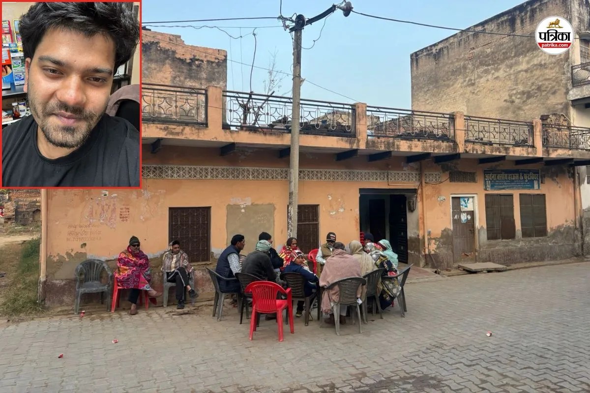 घर के सामने बैठे परिजन व इनसेट में मृतक विपिन। फोटो: पत्रिका
