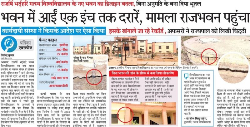 काफी प्रयास के बाद विश्वविद्यालय के लिए नया भवन बनना प्रस्तावित हुआ। वर्ष 2015 में इसका उद्घाटन हुआ। इसके लिए बाकायदा 27 करोड़ रुपए मंजूर हुए। निर्माण से पहले ले आउट प्लान बना। उसी के मुताबिक विश्वविद्यालय के भवन बनने थे। बताते हैं कि भवन के डिजाइन में कार्यदायी संस्था की ओर से बदलाव किया गया। हालांकि यह बिना अफसरों की अनुमति के संभव नहीं लग रहा लेकिन जो प्रशासनिक भवन बनकर तैयार हुआ है उसके नीचे भूमिगत तल बना है। उसी तल के चारों ओर की दीवार में दो इंच की जगह छूट गई है। यानी दीवारें अंदर की ओर भाग रही हैं, जिससे भवन के गिरने की संभावनाएं इंजीनियर बता रहे हैं। राजस्थान पत्रिका ने भवन का मौका मुआयना किया तो भवन की दीवारें जमीन छोड़ रही हैं। कई अन्य खामियां मिली हैं। इससे दूसरे भवनों की गुणवत्ता पर भी शक हो रहा है। कुछ इंजीनियर कहते हैं कि भवन की दोबारा गुणवत्ता परखी जाए तभी यहां विद्यार्थियों को बैठाया जाना चाहिए। कार्यदायी संस्था के एई आरके अरोड़ा से संपर्क किया गया लेकिन फोन रिसीव नहीं किया।