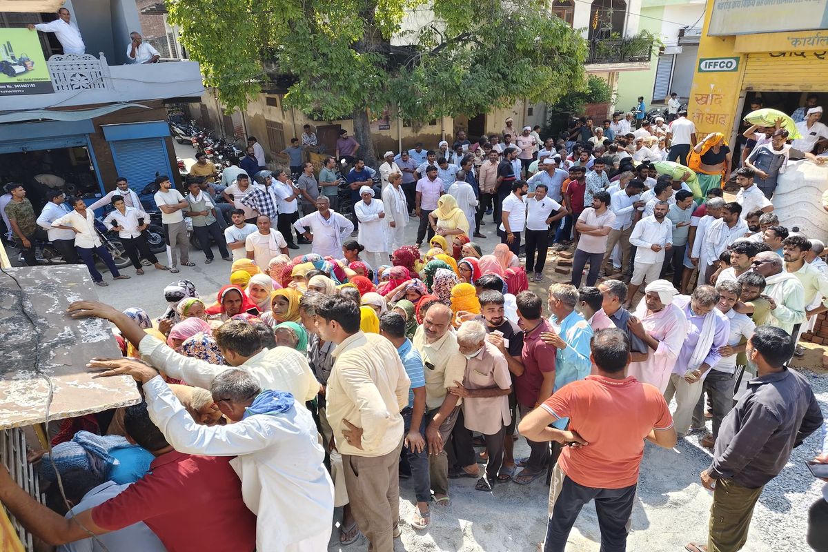 बहरोड़. डीएपी खाद के लिए क्रय-विक्रय सहकारी केंद्र पर कतार में महिला-पुरुष किसान।