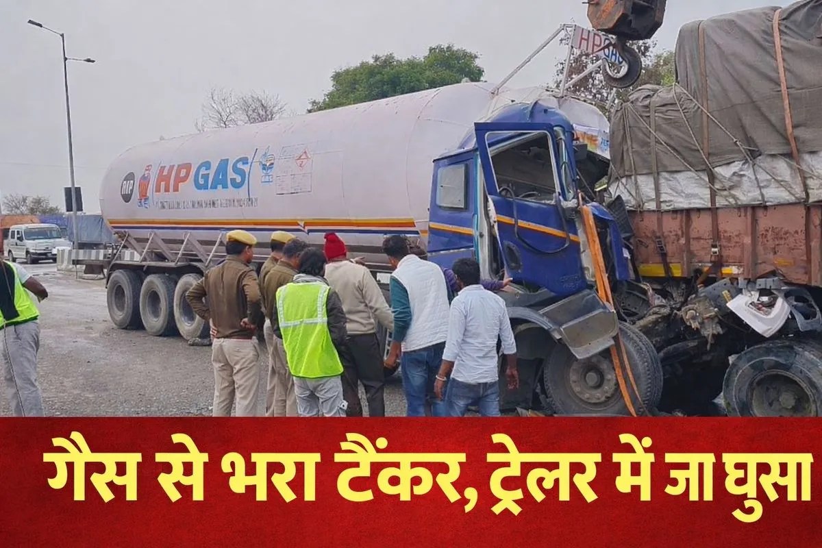 अलवर जिले के बहरोड़ क्षेत्र में दहमी पुलिया के पास शुक्रवार को एक हादसा हो गया। आगे चल रहे ट्रेलर में गैस से भरा एलपीजी टैंकर अचानक जा घुसा। टक्कर इतनी तेज थी कि टैंकर का अगला हिस्सा बुरी तरह क्षतिग्रस्त हो गया और चालक केबिन में फंस गया। हादसे के बाद मौके पर अफरा-तफरी मच गई।