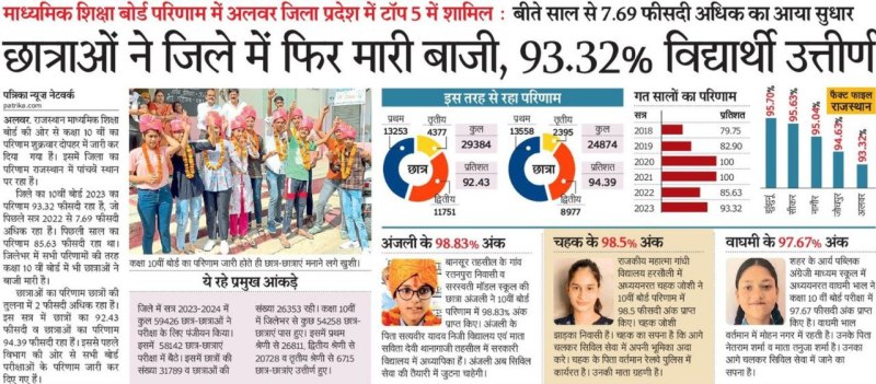 जिले का 10वीं बोर्ड 2023 का परिणाम 93.32 फीसदी रहा है, जो पिछले सत्र 2022 से 7.69 फीसदी अधिक रहा है। पिछली साल का परिणाम 85.63 फीसदी रहा था। जिलेभर में सभी परिणामों की तरह कक्षा 10 वीं बोर्ड में भी छात्राओं ने बाजी मारी है।