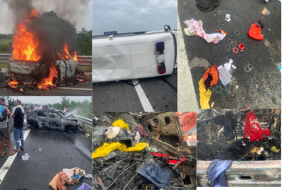 Delhi-Mumbai Expressway Accident Photos: अलवर जिले के राजगढ़ क्षेत्र में मंगलवार सुबह दिल्ली-मुंबई एक्सप्रेसवे पर तेज रफ्तार का खतरनाक नज़ारा देखने को मिला। जिसमें पीछे से आ रही एक तेज कार ने पुलिस वैन को जोरदार टक्कर मार दी।
