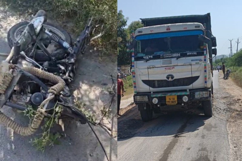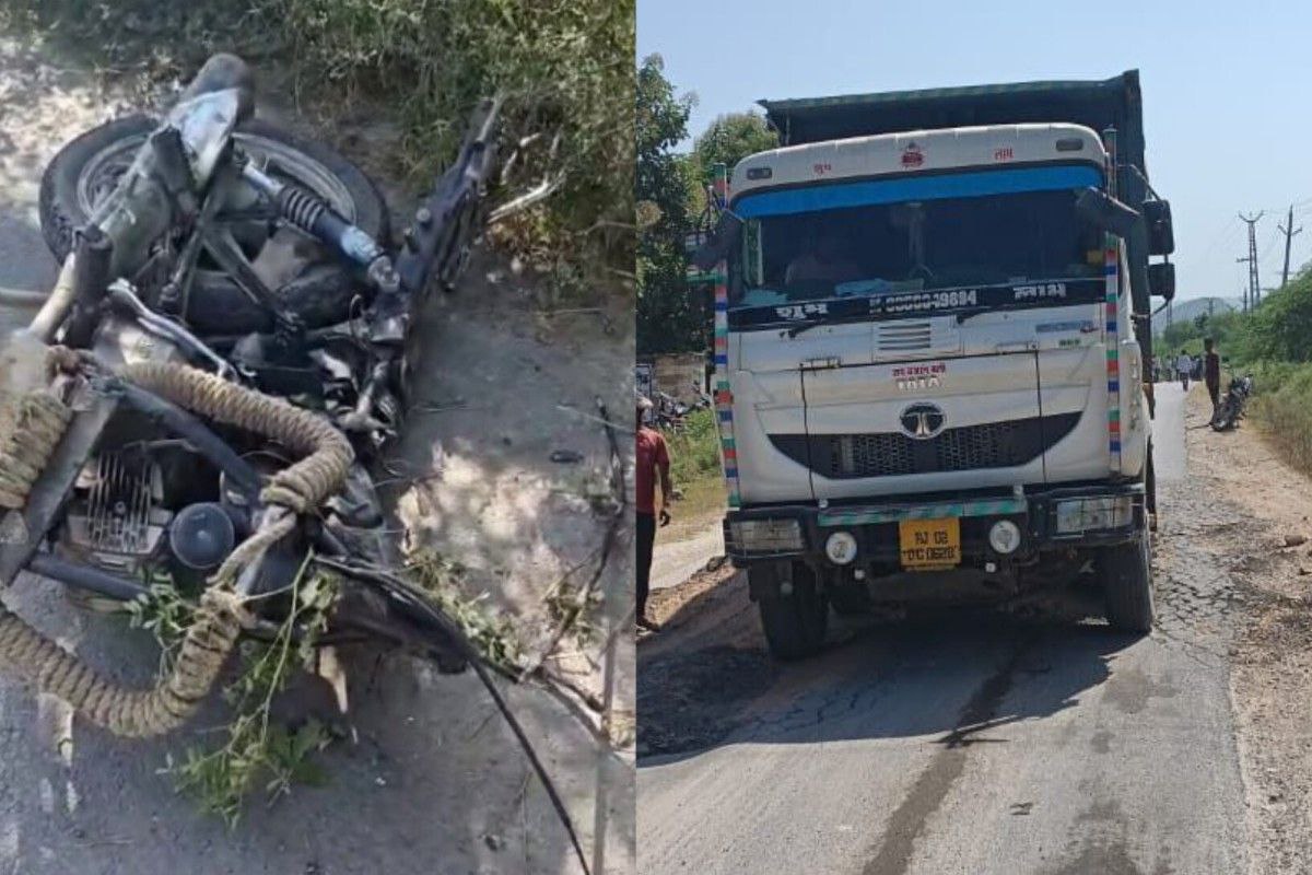 हादसे में क्षतिग्रस्त बाइक और टक्कर मारने वाला डंपर (फोटो - पत्रिका)