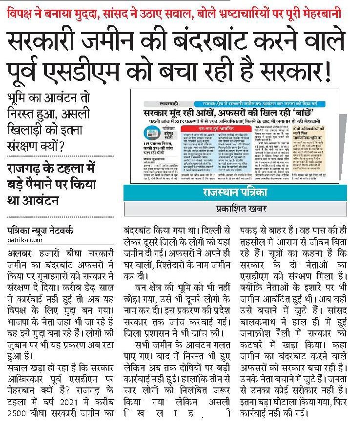 वर्ष 2021 में प्रशासन गांवों के संग अभियान के तहत टहला क्षेत्र में करीब 803 लोगों को 2500 बीघा सरकारी जमीन का आवंटन किया गया। इनमें से करीब 95 लोग ऐसे थे जो प्रभावशाली थे और पैसे की उनके पास कमी नहीं थी। ऐसे में उन्होंने रातोंरात अपनी-अपनी जमीनों की खातेदारी भी करवा ली। यानी सरकारी जमीन पर उनका हक हो गया। जैसे ही मामला एक साल बाद खुला तो उसके बाद फिर नहीं रुका। जिला प्रशासन ने जांच पर जांच बैठाई। सरकार के भी प्रतिनिधि जांच को पहुंचे और मामला आगे बढ़ता गया। राजस्थान पत्रिका ने भी इस मुद्दे को प्रमुखता से उठाया। आखिर में प्रशासन ने सभी 803 जमीनों के प्रस्ताव निरस्त कर दिए। उसके बाद जांच खातेदारी करवाने वाले केसों की चल रही थी।