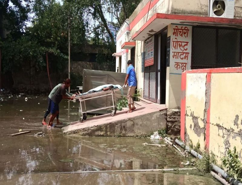 अलवर. सामान्य अस्पताल के मुर्दाघर के बाहर जमा गंदा पानी व शव को स्ट्रेचर पर ले जाते कार्मिक।