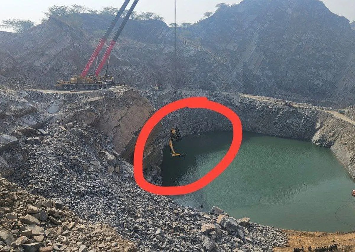 रामगढ़. क्षेत्र के ओड़ेला गांव में खनन क्षेत्र की लीज में हैवी ब्लास्टिंग के कारण पहाड़ ढहने से सौ फीट गहरी खाई में मलबे के नीचे दबी पोकलेन मशीन को पांचवें दिन मंगलवार को निकाल लिया गया है, लेकिन अभी तक मलबे में दबे मशीन ऑपरेटर श्रीकांत तिवारी का पता नहीं चल सका है। मौके पर बचाव कार्य जारी है। एनडीआरएफ और एसडीआरएफ की टीमें लगातार रेस्क्यू कर रही हैं। सोमवार को गाजियाबाद से दो बड़ी क्रेन मंगाई गई थीं। रेस्क्यू टीम के सदस्य ऑक्सीजन सिलेंडरों की सहायता से खाई में भरे पानी में उतरे और पोकलेन मशीन को मंगलवार को निकाल लिया गया। खाई में से पानी को निकालने के लिए अधिक हॉर्स पावर क्षमता की बड़ी मशीन की मदद ली जा रही है। डॉग स्क्वायड टीम भी बुलाई गई है। पहाड़ ढहने की यह घटना शुक्रवार शाम को हुई थी। तभी से बचाव कार्य जारी है। मौके पर उपखंड अधिकारी, तहसीलदार, डीएसपी व थाना अधिकारी मोर्चा संभाले हुए हैं। इधर, मंगलवार को पूर्व विधायक ज्ञानदेव आहूजा मौके पर पहुंचे और पीडि़त परिवार की सांत्वना दी।---