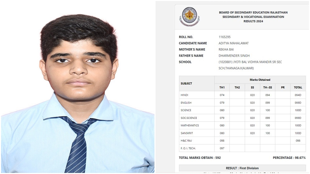 Alwar News : राजस्थान माध्यमिक शिक्षा बोर्ड, अजमेर ने बुधवार शाम को दसवीं बोर्ड का परिणाम जारी कर दिया। बोर्ड प्रशासक महेश चंद्र शर्मा ने रिजल्ट जारी किया। दसवीं का कुल परिणाम 93.03 प्रतिशत रहा। छात्राओं का रिजल्ट 93.46, वहीं छात्रों का रिजल्ट 92.64 फीसदी रहा। वहीं कुछ स्टूडेंट्स ने शानदार प्रदर्शन किया है। अलवर जिले के थानागाजी के रहने वाले आदित्य महालावत ने 600 में से 592 अंक हासिल किए हैं। उसकी 98.67 पर्सेंटेज बनी है। उसे तीन विषयों में 100 में से 100 अंक मिले हैं, जबकि दो विषयों में 99 अंक आए हैं। आदित्य अलव जिले में टॉपर्स लिस्ट में दूसरे स्थान पर है। रिजल्ट आने के बाद उसके परिवार में खुशी का माहौल है।