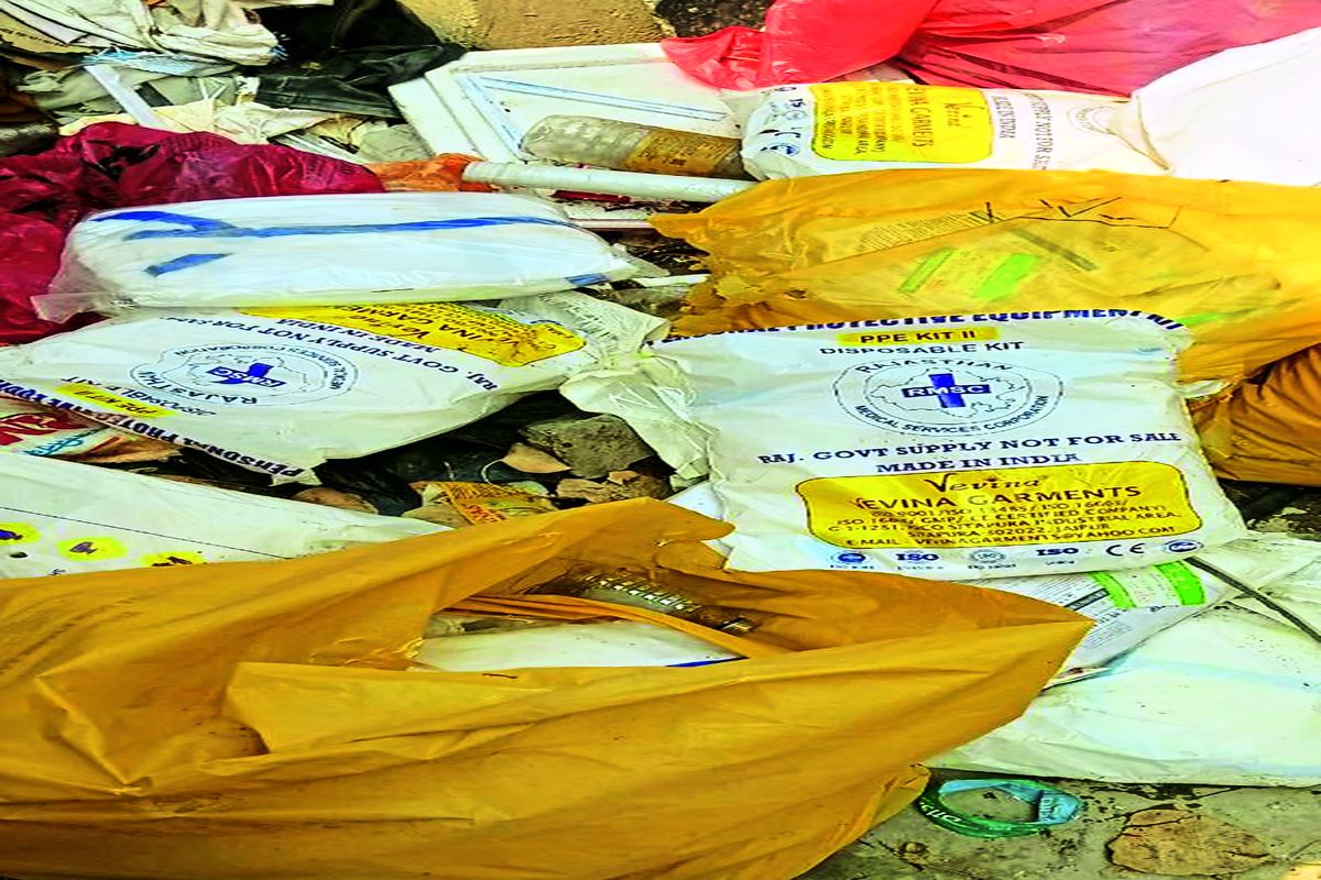 कचरे के ढेर में पड़े पीपीई किट के पैकेट।