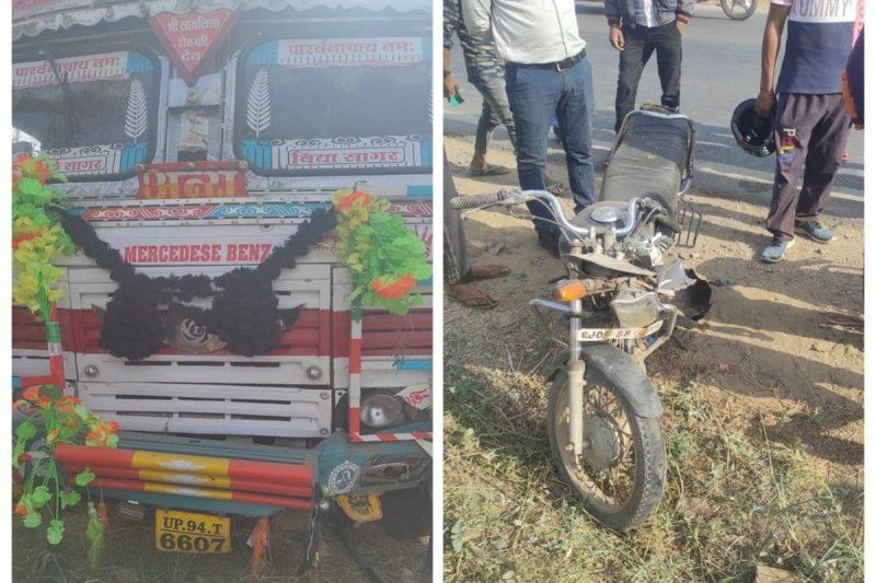 तीनों युवक एक ही मोटरसाइकिल पर सवार थे जिन्हें रूपारेल नदी के निकट 12 चक्का ट्रक UP T 6607 ने पीछे से टक्कर मार दी टक्कर में एक युवक मोहित पुत्र कश्मीर उम्र 18 साल निवासी टिकरी की मौके पर मौत हो गई। वही सुरेश पुत्र रामेश्वर उम्र 19 साल निवासी टिकरी के सिर में गंभीर चोट होने पर सीएचसी बड़ौदामेव से अलवर रैफर कर दिया गया व अजय पुत्र जसवंत उम्र 19 साल निवासी टिकरी गोविंदगढ़ का सीएचसी बड़ौदामेव में उपचार जारी है।