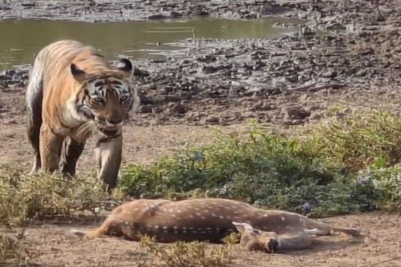 नेचर गाइड अर्जुन मीणा ने बताया कि सदर रेंज के वन क्षेत्र में पर्यटकों को बाघिन एसटी-9 चीतल का शिकार कर पानी से निकलते हुए दिखाई दी। गर्मी से राहत पाने के लिए वह पहले वाटर हॉल में उतरी और फिर पर्यटकों की मौजूदगी से असहज होकर शिकार को लेकर जंगल की ओर चली गई।