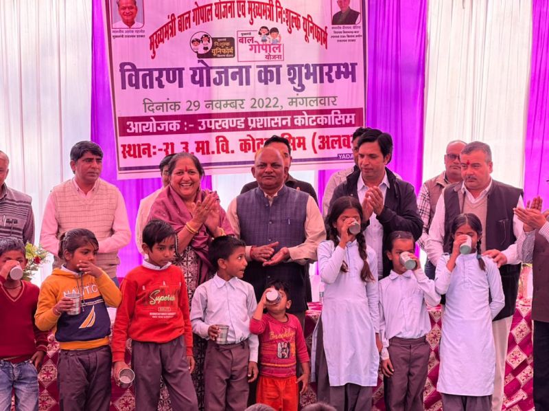 कोटकासिम. राजकीय उच्च माध्यमिक विद्यालय में ब्लॉक स्तरीय मुख्यमंत्री बाल-गोपाल दुग्ध एवं मुख्यमंत्री नि:शुल्क यूनिफॉर्म वितरण योजना का शुभारंभ किया गया। मुख्य अतिथि पंचायत समिति प्रधान डॉ. विनोदकुमारी सांगवान, नगरपालिका चेयरमैन महावीर आचार्य रहे। विशिष्ट अतिथि उपसभापति नगरपालिका कोटकासिम ओमप्रकाश सैनी, उपखंड अधिकारी रामकिशोर मीणा, तहसील डॉ. विक्रमसिंह, नायब तहसीलदार सुमित भारद्वाज रहे। इस अवसर पर छात्र-छात्राओं ने मनमोहक सांस्कृतिक कार्यक्रम प्रस्तुत किए। कार्यक्रम में कस्बे के सभी राजकीय विद्यालयों की भागीदारी रही। इसी तरह टपूकड़ा, शाहबाद क्षेत्र के विद्यालयों में भी योजना का शुभारंभ किया गया। अतिथियों ने वहां बच्चों को दूध पिलाया।