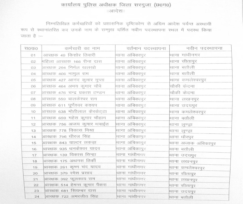 मोतीलाल केरकेट्टा को कमलेश्वरपुर, महेश कुमार चौहान को बतौली थाना, अजय कुमार थवाईत को लुंड्रा, विकास मिश्रा को लुंड्रा, धीरज सिंह को धौरपुर, वाल्टर लकड़ा को आजाक अंबिकापुर, धर्मेंद्र यादव को बतौली थाना में स्थानांतरित किया गया है।