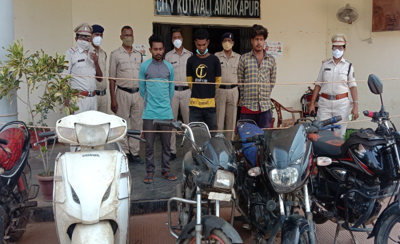 अंबिकापुर. शहर से आए दिन बाइक व स्कूटी चोरी (Bike theft) के मामले में कोतवाली पुलिस (Kotwali police) को सफलता मिली है। पुलिस ने 3 बाइक चोरों के पास से एक स्कूटी व चार बाइक जब्त की है।