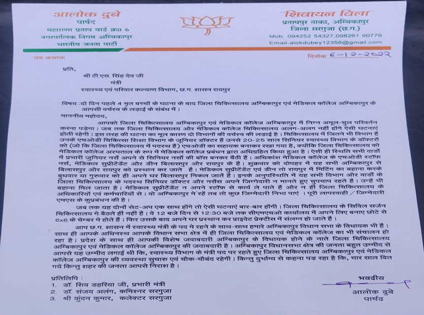 भाजपा पार्षद ने पत्र में लिखा है कि मेडिकल सुप्रीटेंडेंट एवं डीन तो रायपुर में मीटिंग का बहाना करके बुधवार या गुरुवार को ही अपने घर बिलासपुर निकल जाते हैं।