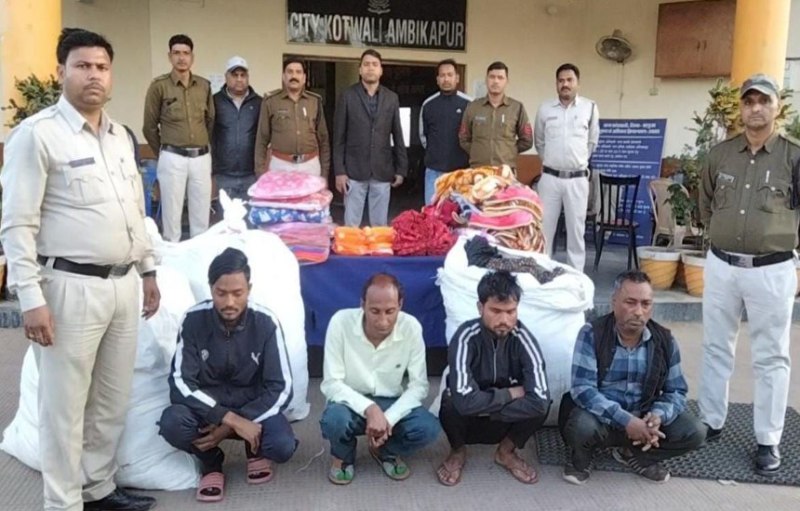 अंबिकापुर. Thieves gang arrested: कपड़े के 2 थोक व्यवसायी के गोदाम से करीब ५ लाख रुपए के कपड़ा चोरी के मामले में पुलिस ने 2 चोर व 2 खरीदार को गिरफ्तार किया है। दोनों आरोपी व्यवसायी के गोदाम से कंबल, चादर सहित अन्य कपड़ा चोरी कर औने-पौने दामों पर फेरीवाले और फुटपाथ वालों को बेच देते थे। पीडि़त व्यवसायियों ने खुद ग्राहक बनकर फुटपाथ पर फेरी वालों से 10 कंबल व चार चादर खरीदी तो पता चला कि उक्त सामान उनके गोदाम से ही चोरी गई है। इसके बाद पुलिस मुख्य चोरों तक पहुंची। पुलिस ने इनके पास से काफी संख्या में चोरी के कपड़े, ९ हजार रुपए नकद सहित कुल 5 लाख रुपए का सामान जब्त किया है। पुलिस ने सभी के खिलाफ कार्रवाई कर जेल दाखिल कर दिया है।