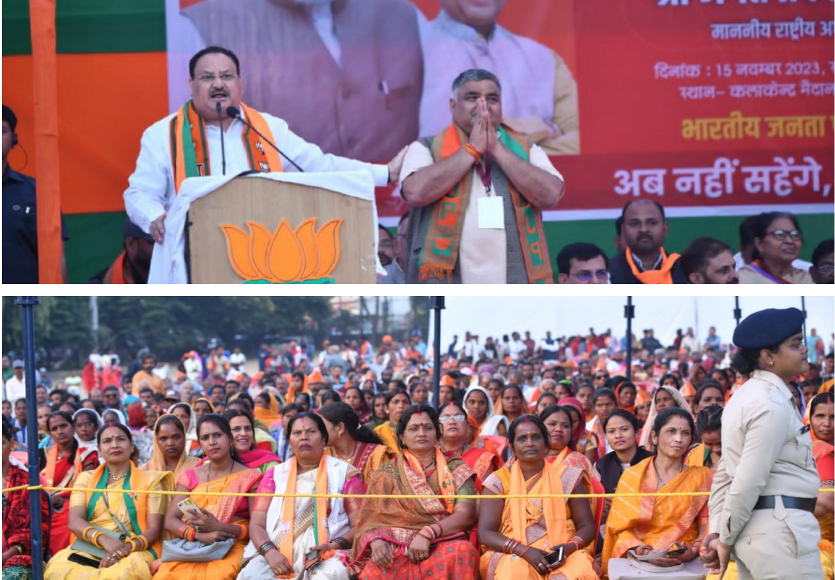अंबिकापुर. CG Election 2023: विधानसभा चुनाव प्रचार के आखिरी दिन भाजपा के राष्ट्रीय अध्यक्ष जेपी नड्डा अंबिकापुर पहुंचे। उन्होंने कलाकेंद्र मैदान में आयोजित सभा में 20 मिनट का उद्बोधन देते हुए भाजपा उम्मीदवारों के पक्ष में वोट करने की अपील की। उन्होंने कहा आप लोगों का जोश व उमंग आश्वस्त करता है कि 17 तारीख को आपने राजेश अग्रवाल को छत्तीसगढ़ की विधानसभा में भेजने का निर्णय ले लिया है। राजनीति में तालियों की गडग़ड़ाहट से, इसकी आवाज से हम पहचान लेते हैं कि आप लोगों में कितना जोश है और आपने अपना मन बना लिया है। यह चुनाव सिर्फ एक प्रत्याशी का नहीं है, वे आने वाले पांच साल के लिए आपके हक की रक्षा करने के लिए एक माध्यम हैं। उन्होंने कहा कि एक तरफ भारतीय जनता पार्टी है, एक तरफ बेईमानी से ग्रसित कांग्रेस पार्टी है। भाजपा आपके हितों की चिंता करती है, कांग्रेस आपके हितों पर डाका डालती है।