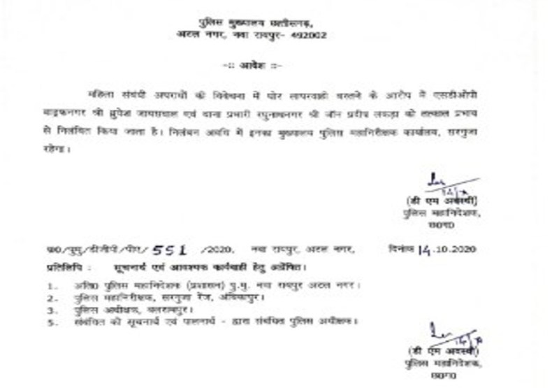 दोनों के खिलाफ महिला अपराधों की विवेचना में लापरवाही बरतने पर कार्रवाई की गई है। निलंबन अवधि में दोनों को सरगुजा आईजी कार्यालय (IG office) में नियत किया गया है।
