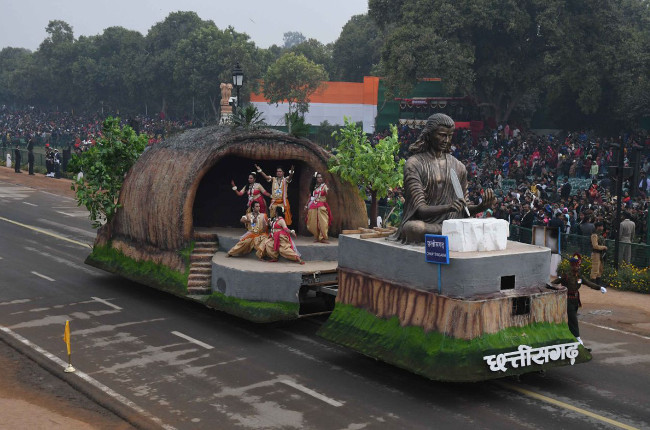 छत्तीसगढ़ की झांकी में रामगढ़ की पहाडिय़ों में महाकवि कालीदास द्वारा रचित मेघदूत को झांकी के साथ प्रदर्शित किया जाएगा। इस झांकी में इंदिरा कला संगीत विश्वविद्यालय के कत्थक, ओडि़सी और भरतनाट्यम के कलाकार अपनी कला का प्रदर्शन कर रहे हैं।
