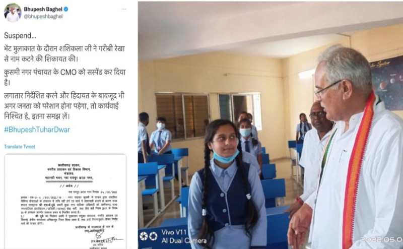 सामरी विधानसभा क्षेत्र के दौरे पर कुसमी नगर पंचायत पहुंचे सीएम भूपेश बघेल एक्शन में दिखे। उन्होंने आज की पहली कार्रवाई नगर पंचायत कुसमी सीएमओ एसके दुबे को सस्पेंड (CMO suspended) कर की। राशन दुकान के निरीक्षण के दौरान एक महिला हितग्राही शशिकला ने सीएम से शिकायत की कि उसका नाम गरीबी रेखा (Poverty line) से काट दिया गया है,