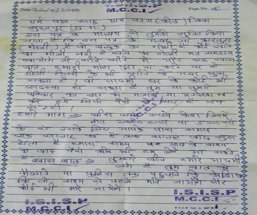 लेटर में लिखा गया है कि उन्हें 20 लाख रुपए 2000-2000 और 500-500 के नोट में चाहिए। यदि पुलिस या अन्य किसी से यह बात बताई तो समय से पहले गोली उसे या उसके परिवार के किसी सदस्य को मार दी जाएगी।