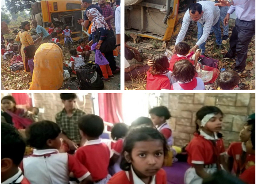 टक्कर इतनी तेज थी कि बस सडक़ किनारे पलट गई। हादसे में बस में सवार बच्चों के बीच चीख-पुकार मच गई। बच्चे रोने लगे।