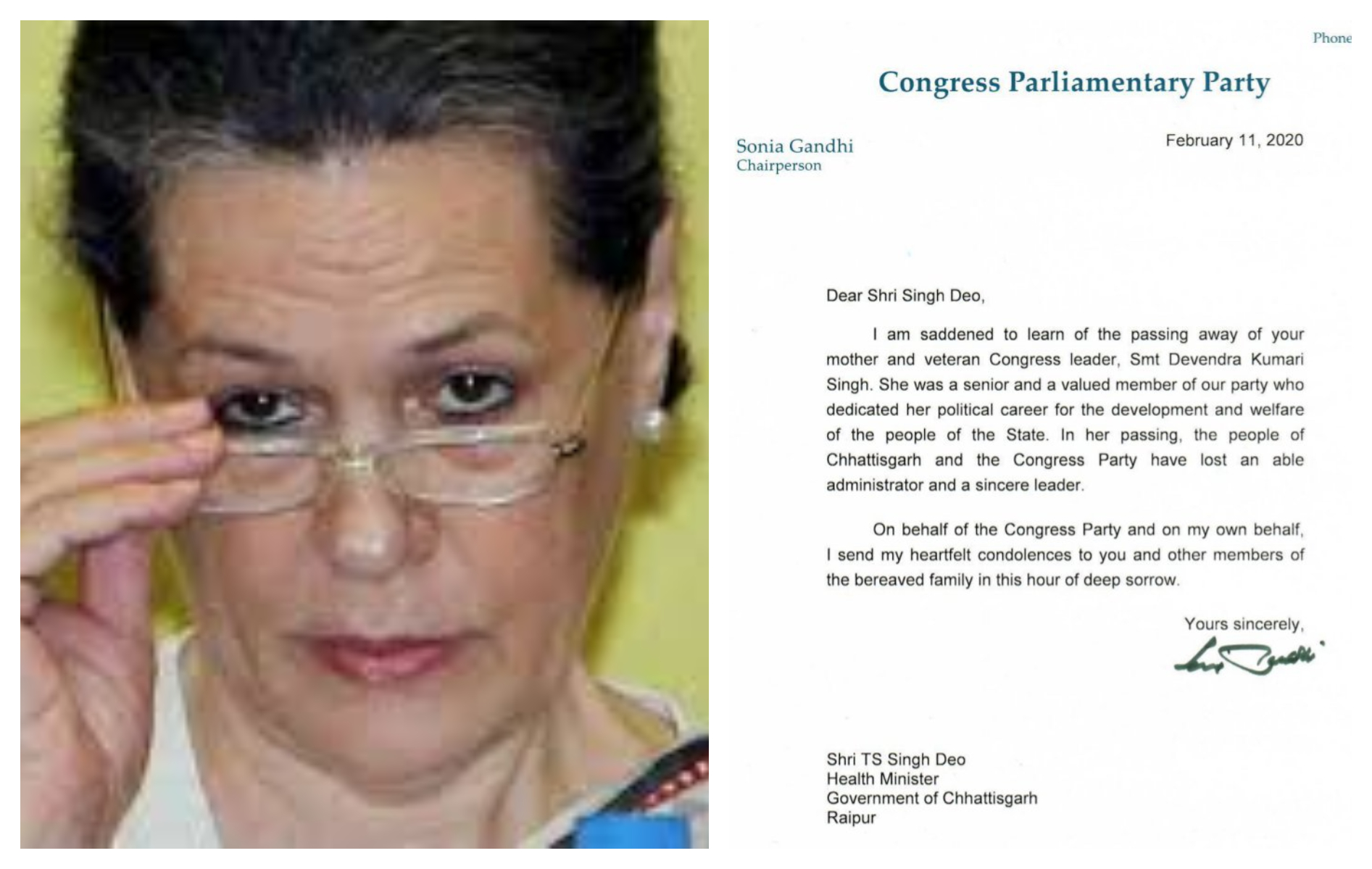ऑल इंडिया कांग्रेस कमेटी की राष्ट्रीय अध्यक्ष सोनिया गांधी ने भी राजमाता देवेंद्र कुमारी सिंहदेव के निधन पर शोक जताया है। इस संबंध में उन्होंने टीएस सिंहदेव को पत्र भी भेजा है। पत्र में उन्होंने लिखा है कि ‘मुझे आपकी मां और अनुभवी कांग्रेस नेता श्रीमती देवेन्द्र कुमारी सिंहदेव के निधन का दुख है।