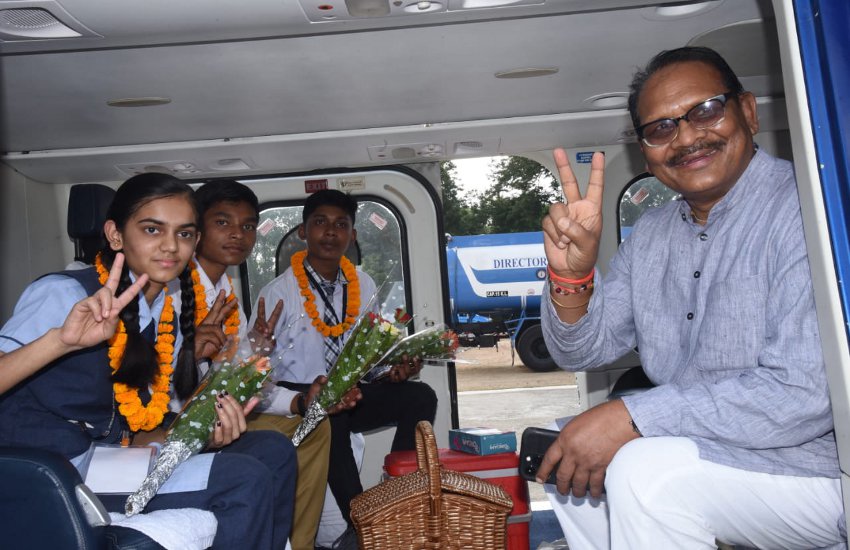 इसमें सरगुजा संभाग के भी तीन छात्र शामिल हुए। जॉयराइड के बाद तीनों छात्र राजधानी रायपुर से शिक्षा मंत्री के साथ हेलीकॉप्टर में सवार होकर अंबिकापुर के पीजी कॉलेज ग्राउंड पहुंचे जहां स्कूल शिक्षा मंत्री डॉ प्रेमसाय सिंह टेकाम और बच्चों का स्वागत प्रशासनिक अधिकारियों द्वारा किया गया। इस दौरान स्कूल शिक्षा मंत्री डॉ. टेकाम ने बताया मुख्यमंत्री के घोषणा के अनुसार 10वीं और 12वीं की परीक्षा में टॉप करने वाले 88 छात्रों को रायपुर में हेलीकॉप्टर के माध्यम से हवाई सैर कराई गई है जिसमें संभाग से सरगुजा जिले के भूपेंद्र खेस्स और वंशिका गुप्ता तथा सूरजपुर के एक छात्र किशोर राजवाड़े शामिल हैं। कलेक्टर कुन्दन कुमार ने बच्चों को बधाई एवं शुभकामनाएं प्रेषित की।