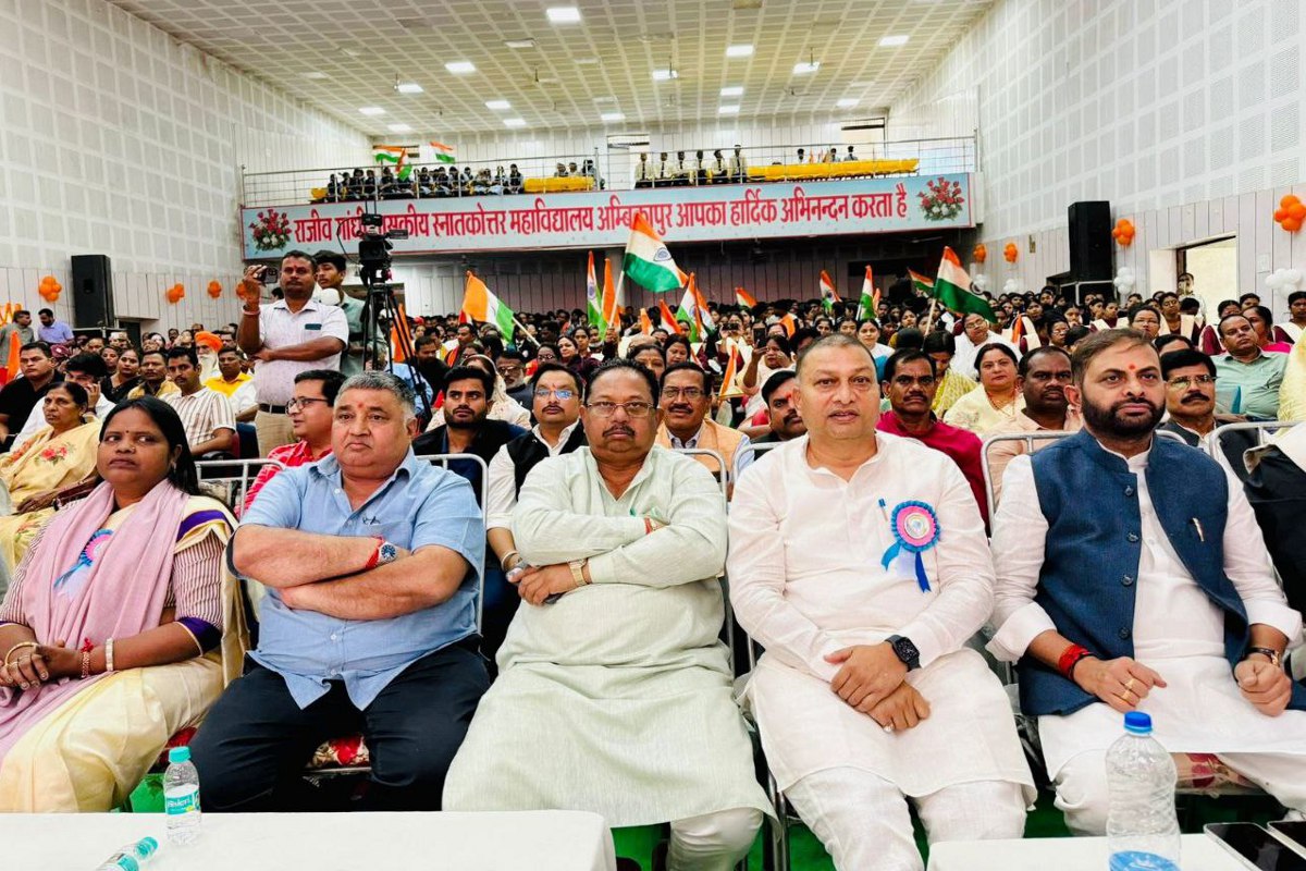 अंबिकापुर. पीजी कॉलेज के ऑडिटोरियम भवन में भाजपा सरगुजा द्वारा वंदे मातरम् गीत (Vande Matram song) का सामूहिक गायन कार्यक्रम का आयोजन किया गया। कार्यक्रम में मुख्य अतिथि के रूप में पर्यटन मंत्री राजेश अग्रवाल, विशिष्ट अतिथि के रूप में भाजपा के प्रदेश महामंत्री अखिलेश सोनी, भाजपा जिलाध्यक्ष भारत सिंह सिसोदिया, विधायक प्रबोध मिंज, विधायक राजकुमार टोप्पो, महापौर मंजूषा भगत एवं जिला पंचायत अध्यक्ष निरूपा सिंह उपस्थिति रहीं।