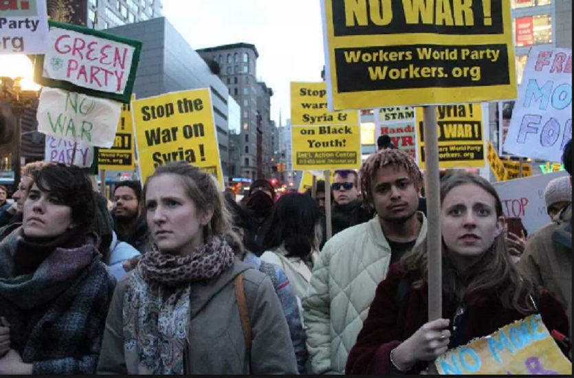न्यूयॉर्क: सीरिया पर अमेरिका के नेतृत्व में हुए हवाई हमलों के खिलाफ न्यूयॉर्क के यूनियन स्क्वायर में विरोध प्रदर्शन हुए। न्यूयॉर्क यूनिवर्सिटी के क्वीन्स कॉलेज के सहायक लेक्चरर गॉर्डन बार्न्स ने कहा, "मैं इसके खिलाफ हूं। यह मध्यपूर्व में अमेरिकी तानाशाही का एक और उदाहरण है।"समाचार एजेंसी सिन्हुआ के मुताबिक, शनिवार को हुए इस प्रदर्शन में हिस्सा लेने वाले बार्न्स का कहना है कि मुझे विश्वास नहीं हो रहा है कि सैन्य हमलों से सीरिया में समस्याओं का समाधान होगा ।