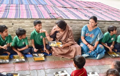 मध्याह्न भोजन के समय उन्होंने छात्रों के साथ जमीन पर बैठकर वही भोजन ग्रहण किया जो छात्रों को परोसा गया। भोजन की गुणवत्ता की स्वयं जांच कर उन्होंने संतोष व्यक्त किया। उन्होंने अपने हाथों से छात्रों को भोजन कराकर मातृवात्सल्य का अनुभव कराया।