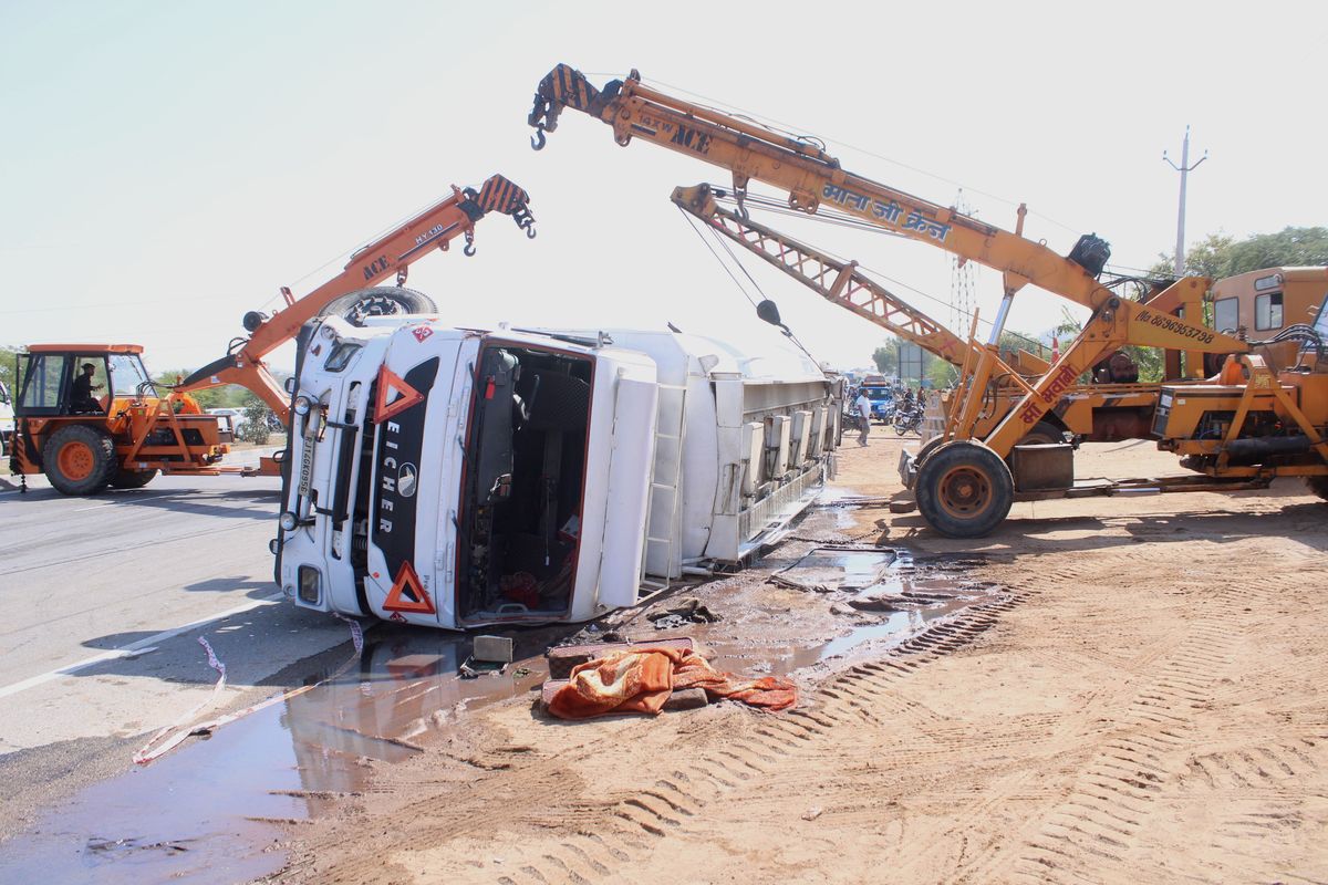 पुलिस के अनुसार दुर्घटना में साइकिल सवार दम्पती लोहागल निवासी रामेश्वर व उसकी पत्नी काजल जख्मी हो गए। एनएचएआई की एम्बुलेंस से दोनों को जेएलएन अस्पताल पहुंचाया। सूचना मिलते ही अलवर गेट व सिविल लाइन्स थाना पुलिस घटनास्थल पर पहुंची। करीब एक घंटे तक राजमार्ग बाधित रहा। पुलिस ने तीन क्रेन की मदद से डीजल टैंकर को सीधा करवाया।