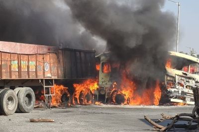 दो जने गंभीर रूप से झुलसे, दो अन्य हुए चोटिल, जयपुर से आ रहे कोयले से भरे ट्रेलर को पीछे से आए ट्रेलर ने मारी टक्कर