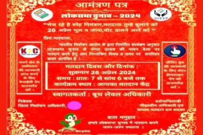 26 अप्रैल के मतदान को लेकर एक आमंत्रण पत्र सामने आया है, जो अभी यूपी में चर्चा का विषय बना हुआ है। शादी के कार्ड की तरह इस कार्ड में भी दिन, तारीख, समय, कार्यक्रम स्थल, निवेदक, स्वागतकर्ता, दर्शनाभिलाषी के साथ बाल मनुहार भी छपी हुई है।