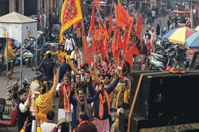 कार्यक्रम के अंतर्गत बैंड-बाजों के साथ भगवा ध्वज यात्रा निकाली गई। ध्वज यात्रा त्रिपोलिया स्थित प्राचीन गणेश मंदिर से विधिवत पूजा-अर्चना के बाद प्रारंभ हुई, जो बजाजा बाजार, होप सर्कस सहित प्रमुख मार्गों से होती हुई अभय समाज परिसर पहुंची। यात्रा के दौरान श्रद्धालु जय श्रीराम के जयघोष करते हुए धार्मिक भजनों पर झूमते नजर आए। पूरे मार्ग पर भक्तिमय वातावरण बना रहा और जगह-जगह श्रद्धालुओं ने पुष्प वर्षा कर ध्वज यात्रा का स्वागत किया।