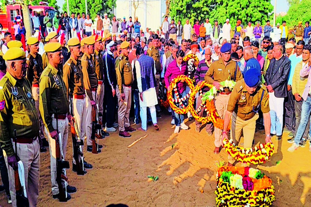 एएसआई सुरेंद्र सिंह ओला की गुरुवार को राजकीय सम्मान के साथ नीमराणा स्थित उनके पैतृक गांव माजरा काठ में अंत्येष्टि हुई। गमगीन माहौल में ग्रामीणों ने उन्हें विदाई दी। सम्मान में गार्ड ऑफ ऑनर दिया। जयपुर से पुलिस वाहन में ट्रैफिक एसपी सागर राणा व अन्य अधिकारियों और जवानों के साथ एएसआई की पार्थिव देह गांव से बाहर हाइवे पर हीरो चौक पहुंची। जहां हाथों में तिरंगे झंडे लगे सैकड़ों ग्रामीणों व युवाओं ने एएसआई सुरेंद्र ङ्क्षसह अमर रहे के नारे लगा प्रशासन व पुलिस अधिकारियों की अगुवाई में खुले पुलिस वाहन में जवान की पार्थिव देह को एक यात्रा के रूप में घर पर ले जाया गया। जहां अंतिम यात्रा की रस्में पूरी की गई। अधिकारियों, जनप्रतिनिधियों व लोगों ने पुष्पचक्र व पुष्प अर्पित कर श्रद्धांजलि दी। उनके पुत्र आकाश ने मुखाग्नि दी। दिवंगत एएसआई के पिता पूर्व सैन्य अधिकारी रोहिताश्व ओला भी मौजूद रहे। एएसआई को शहीद का दर्जा देने व परिवार की मांगों को लेकर सीएम प्रतिनिधि के रूप में आए विधायक राजेंद्र भांभू ने सीएम की ओर शोक संवेदनाओं की बात तो दोहराई लेकिन कोई घोषणा नहीं की। उन्होंने कहा कि सीएम बड़े संवेदशील है वो जरूर शोक संतप्त सुरेंद्र के परिवार की सुख सुविधाओं लिए जो भी संभव होगा करेंगे। उन्होंने परिजनों की मांग के सवाल पर कहा परिवार की मांगे तो आई हैं, लेकिन सरकार की कुछ गाइडलाइंस बनी हुई है, उनके अनुरूप जो भी कुछ हो सकता है किया जाएगा। इस दौरान सीएम प्रतिनिधि विधायक राजेन्द्र भांभू, जयपुर ट्रैफिक एसपी सागर राणा, एएसपी राजवीर, एसडीएम महेंद्र ङ्क्षसह, तहसीलदार अभिषेक, एएसपी शालिनी राज, डीएसपी सचिन शर्मा, थानाधिकारी महेंद्र यादव, पूर्व विधायक मंजीत धर्मपाल चौधरी, मुंडावर विधायक ललित यादव, जिला प्रमुख बलबीर छिल्लर, बलवानङ्क्षसह, अशोक खण्डेलवाल, देवेंद्र, राकेश आदि लोग मौजूद रहे।