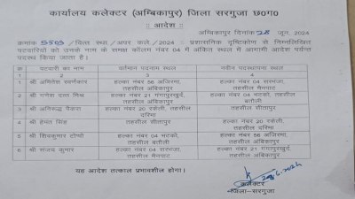 इसी प्रकार अनिरुद्ध पैकरा हल्का नंबर 20 रकेली दरिमा को सीतापुर तहसील, हेमंत सिंह को सीतापुर तहसील से रकेली दरिमा, शिवकुमार टोप्पो को बतौली के भटको से हल्का नंबर 56 अजिरमा तथा संजय कुमार को मैनपाट के सरभंजा से गंगापुर खुर्द अंबिकापुर ट्रांसफर किया गया है।
