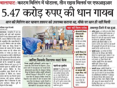 बता दें कि धान के सत्यापन कार्य के दौरान जिले की तीन राइस मिलो से सरकारी धान गायब पाया गया है। इनमें खैरलांजी स्थित श्रीमातारानी राइस मिल से एक करोड़ 49 लाख 22 हजार 331 रुपए का 6488 क्विंटल, लांजी स्थित मां पूर्णा राइस मिल से एक करोड़ 29 लाख 46 हजार 700 रुपए का 5629 क्विंटल और लालबर्रा स्थित मां कमला देवी राइस मिल गर्रा से दो करोड़ 68 लाख 89 हजार 300 रुपए का 11691 क्विंटल कुल 5 करोड़ 47 लाख 58 हजार 331 रुपए का 23808 क्विंटल धान गायब होना पाया गया है। तीनों मिल संचालक क्रमश: विवेक मिश्रा, विवेक मस्करे और सुधीर तिवारी, विशाल गंगवानी पर संबंधित थानों में एफआईआर दर्ज कराई गई है।